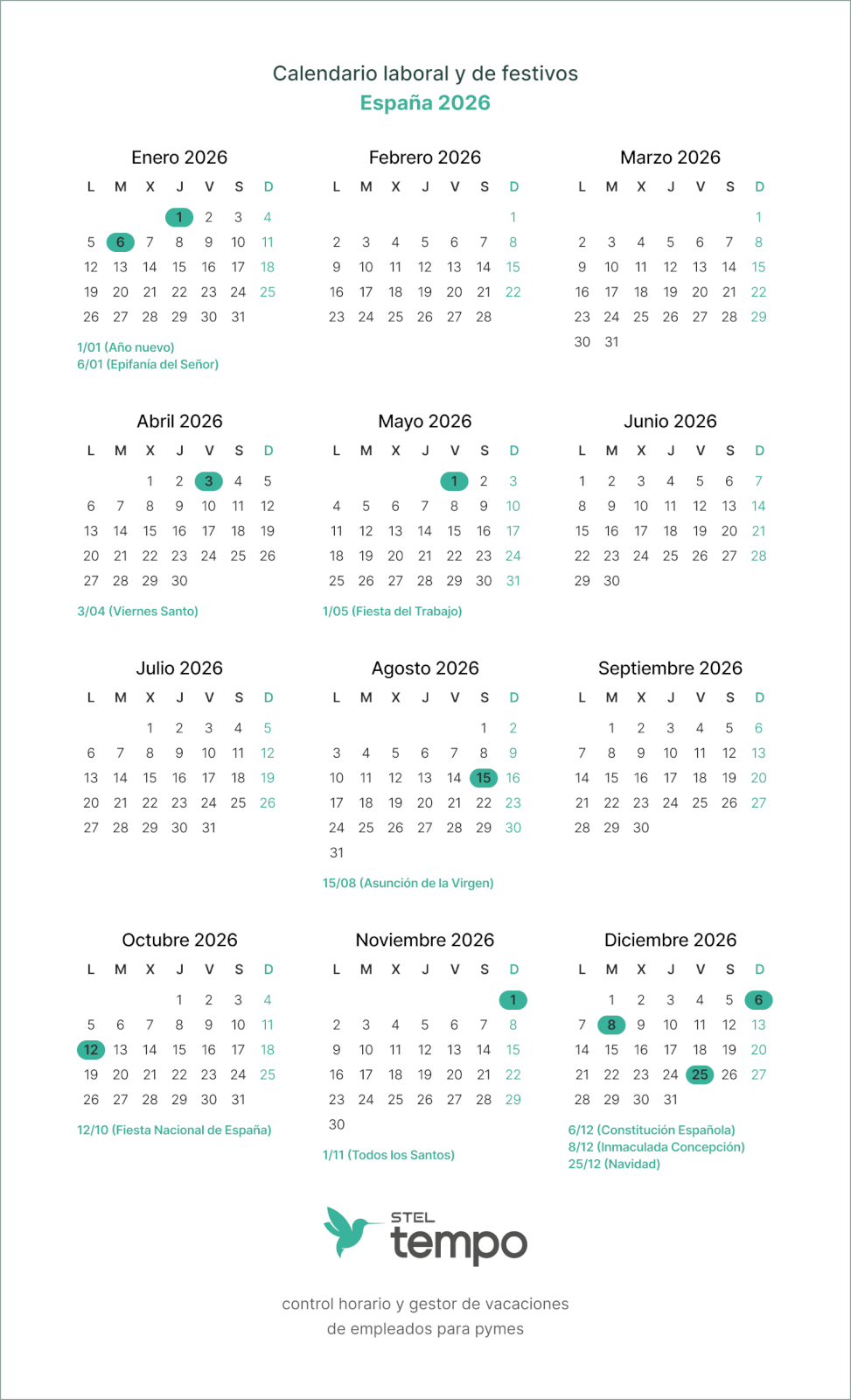 El calendario laboral en España para 2026 establece un total de 14 días festivos por municipio. Estos se componen de: