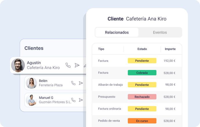 Registra todos tus contactos, observaciones, clientes potenciales y consulta todos sus informes. Usa plantillas para mejorar la comunicación y agilizar tu actividad comercial: convierte presupuestos en pedidos, gestiona entregas con firma y mucho más.