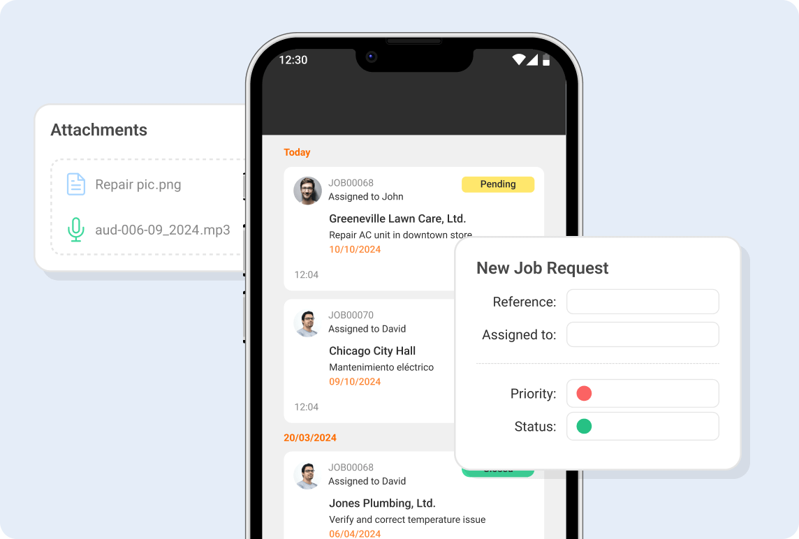In addition, you can create commercial documentation related to the job request, such as quotes and invoices, and add multimedia elements like photos and audio for more complete documentation.