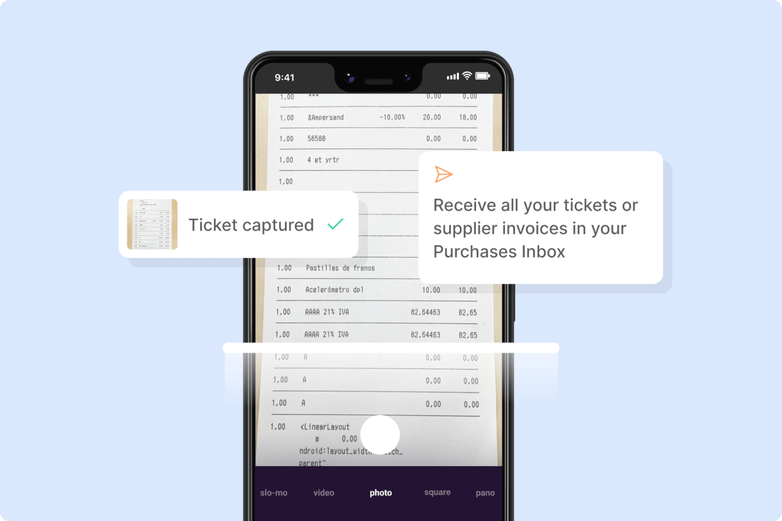 Just upload the document or take a photo from the app, and the system detects the supplier, amounts, dates, and product lines — eliminating manual work and preventing typing errors.