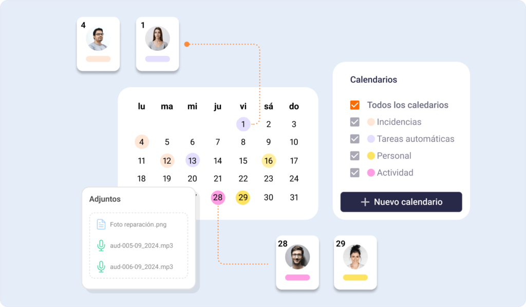 Centraliza calendarios con tus empleados, vinculando cada evento con tu cartera de clientes y la documentación que necesites.