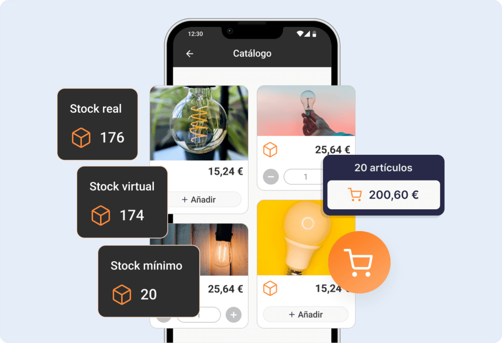 Controla el stock real y virtual de todos tus almacenes, añade fotos ilimitadas y gestiona servicios como mano de obra, transporte o desplazamientos, incluyendo tarifas especiales por cliente o zona.