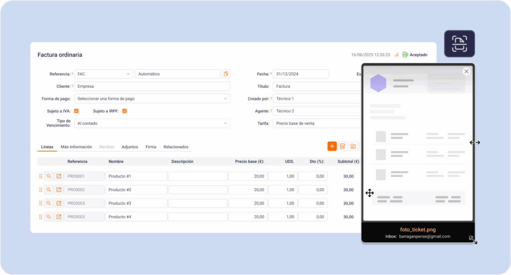 Solo tienes que subir el documento, o hacerle una foto desde la app, y el sistema detecta el proveedor, los importes, las fechas y las líneas de producto. Así eliminas el trabajo manual y evitas errores de tecleo.