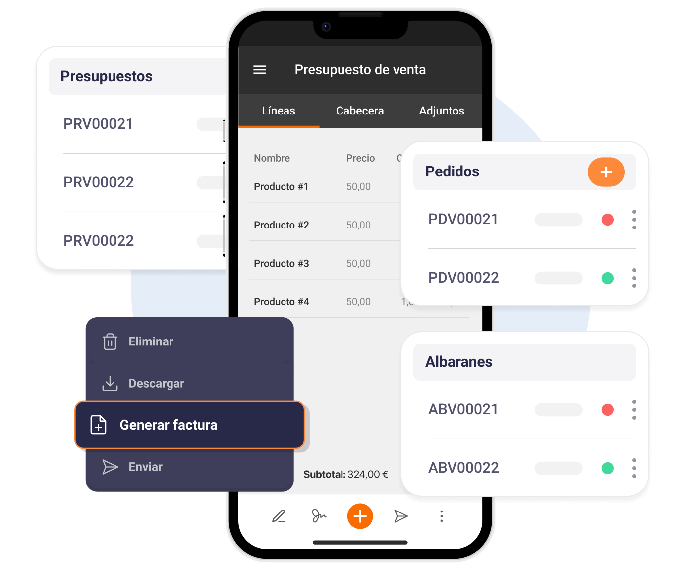 Convierte presupuestos en pedidos, albaranes o facturas. Genera presupuestos recurrentes y visualiza informes por cliente, empleado o producto.