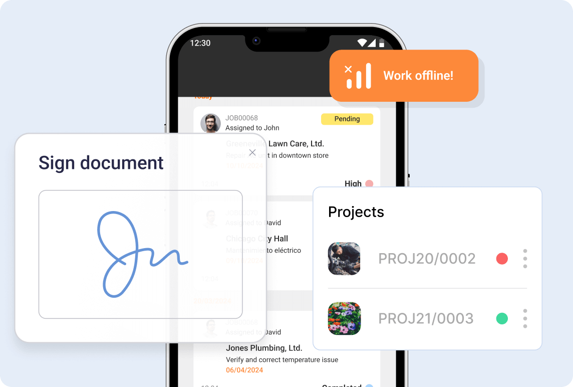 Schedule periodic maintenance, manage work notes, equipment warranties and repairs, and collect client signatures on any of the documents you create in the system.