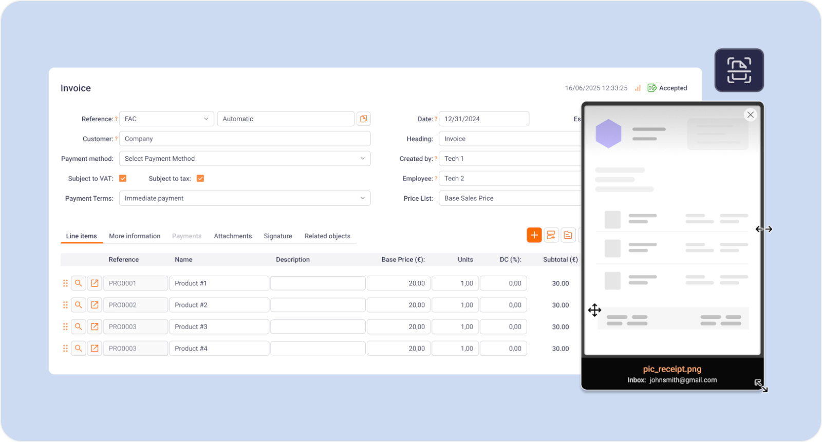 Just upload the document or take a photo from the app, and the system detects the supplier, amounts, dates, and product lines — eliminating manual work and preventing typing errors.