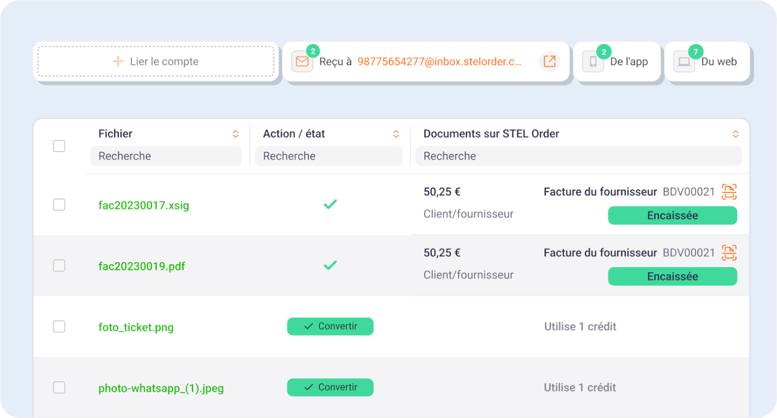 Recevez dans votre Inbox Achats tous vos tickets de caisse ou factures fournisseur, qu’ils soient en PDF, JPEG, PNG ou en factures électroniques au format .xml ou .xsig.