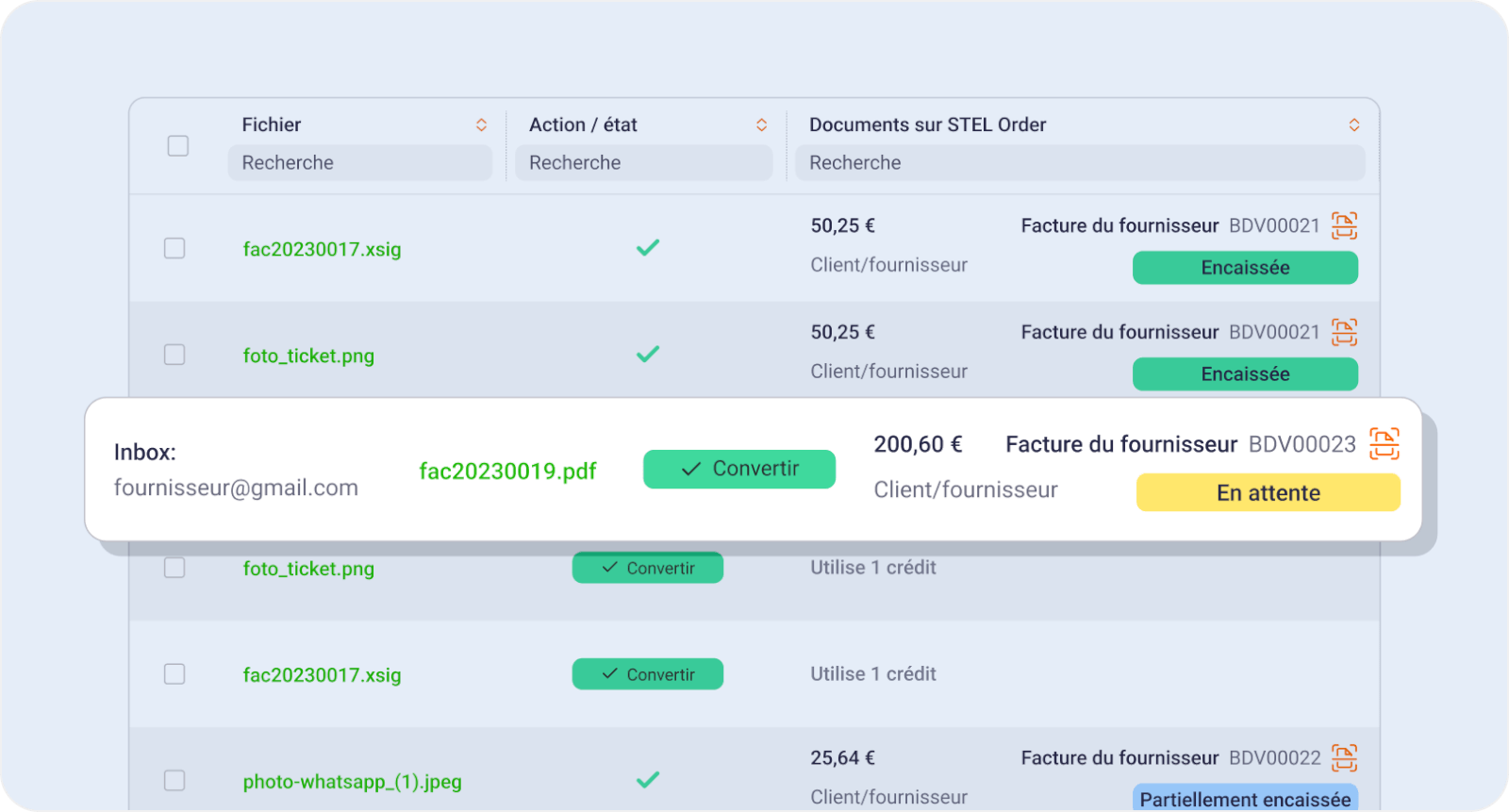 L’OCR (reconnaissance optique de caractères) de STEL Order identifie automatiquement les informations de vos factures, bons de livraison ou commandes et les transforme en données réelles dans l’ERP.