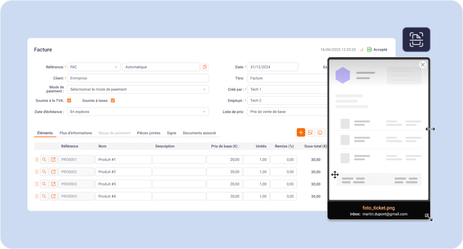 Copiez les données de votre ticket ou facture à l’aide de la visionneuse d’image flottante, que vous pouvez déplacer, agrandir et redimensionner pour plus de confort.