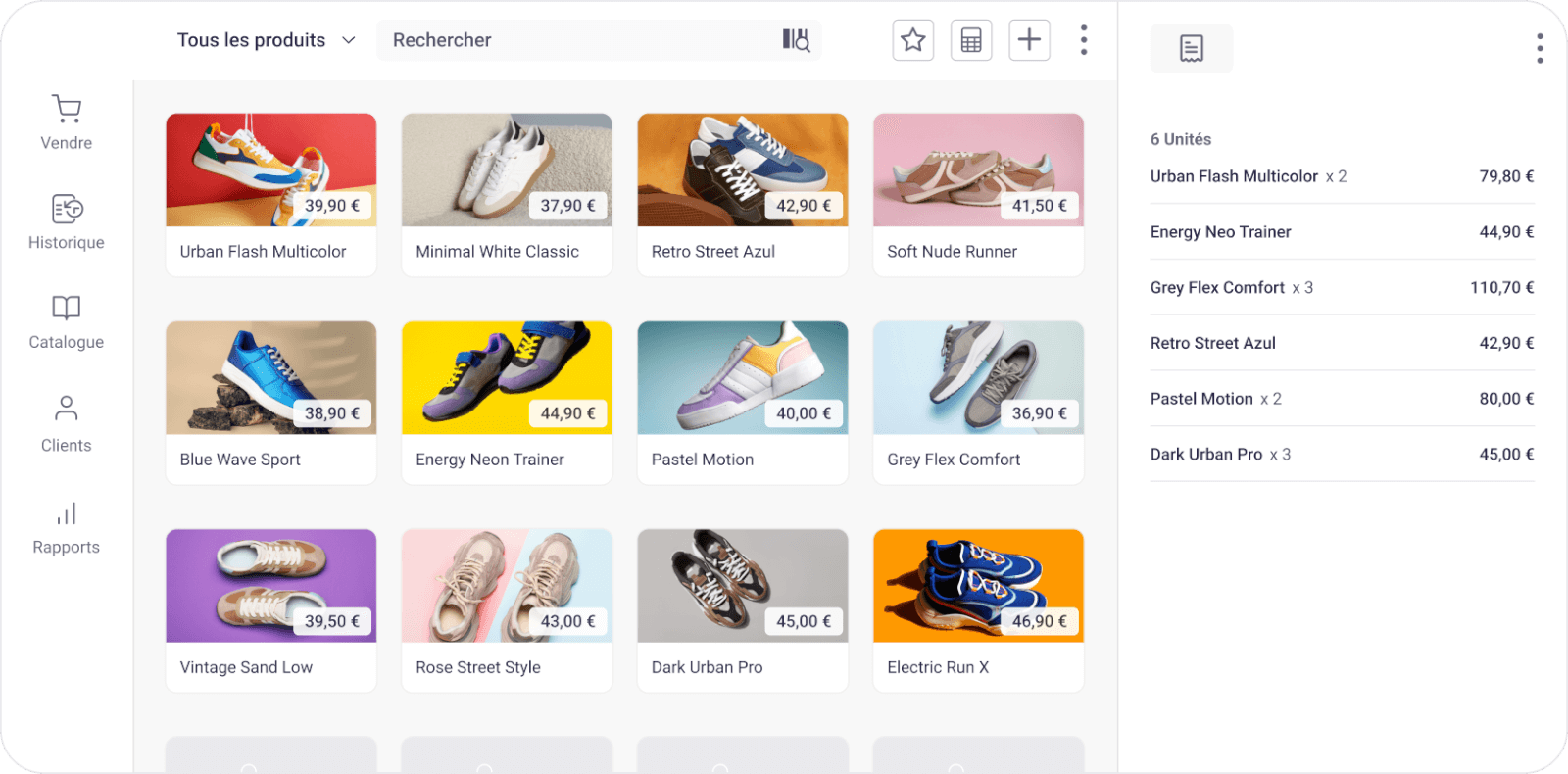 Interface tactile, recherche instantanée de produits et gestion fluide des tickets.